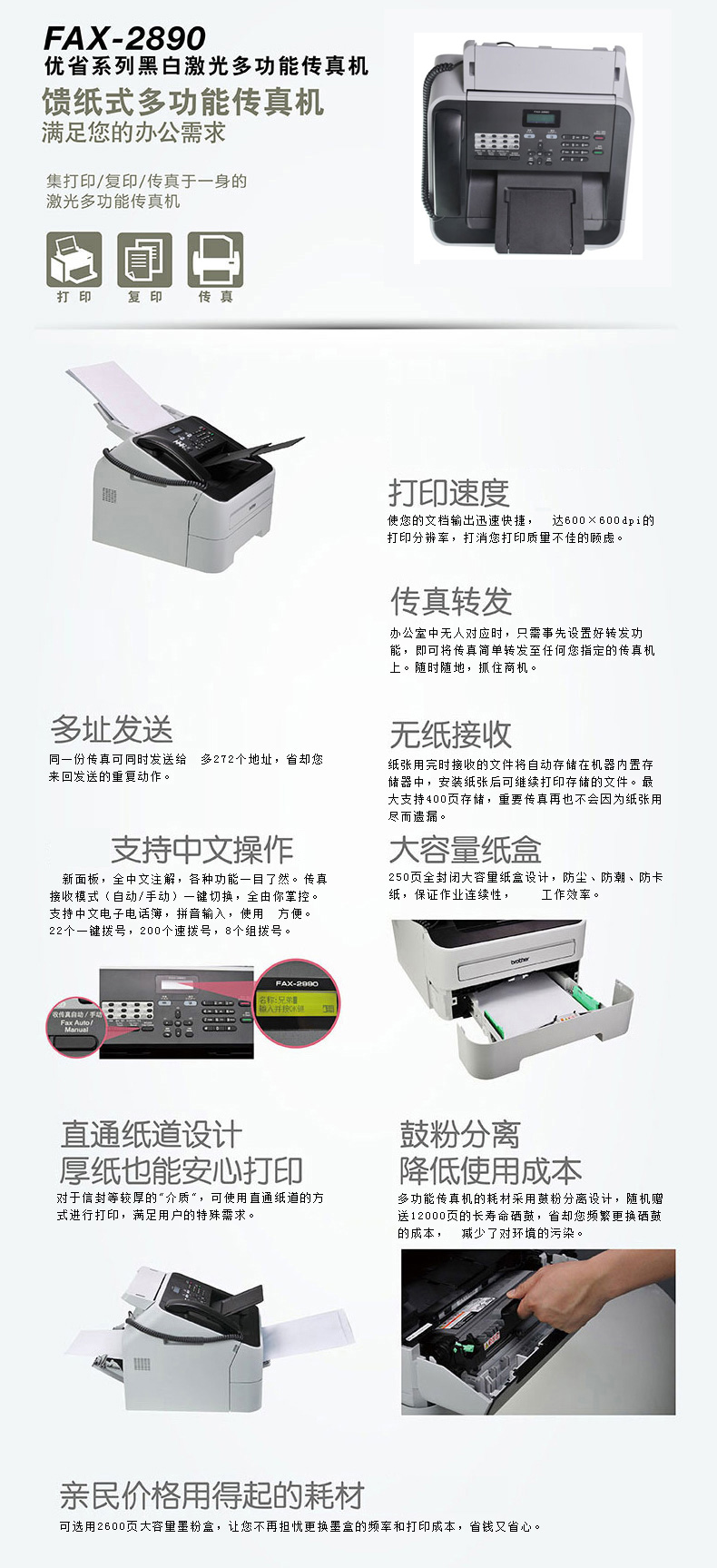 商品名称:兄弟FAX-2890 黑白激光多功能传真机A4纸打印复印一体机电话办公家用商用替2820 FAX-2890官方标配
